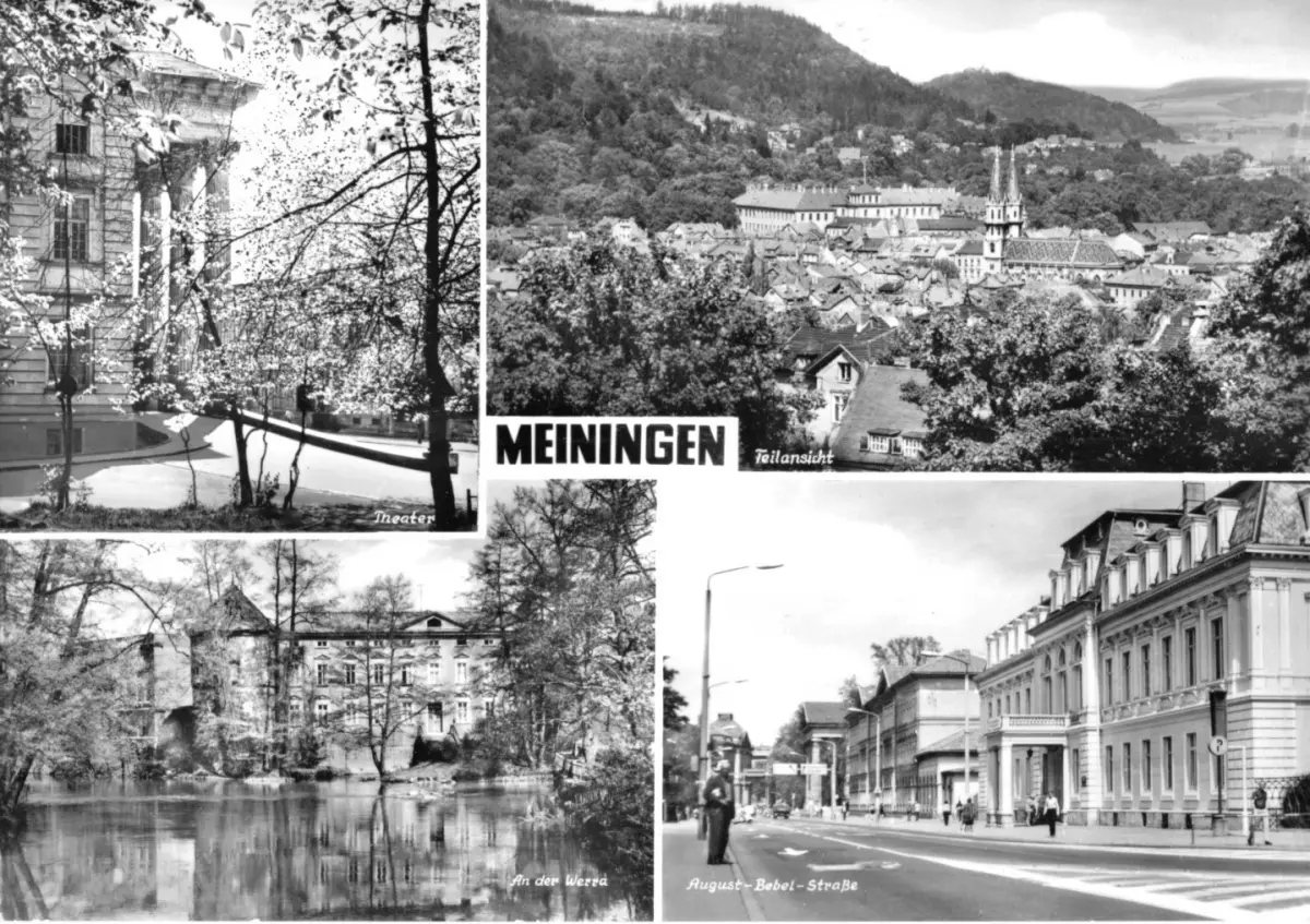 Ansichtskarte Meiningen vier Abb. - Theater, Teilansicht, An der Werra, August-Bebel-Str. Erhaltung I ungelaufen Druckvermerk: 1978 Herstellungsland: DDR Verlag: Straub & Fischer, Meiningen - 8901