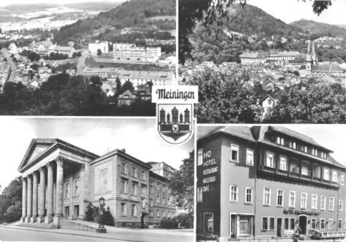Ansichtskarte Meiningen vier Abb. - Theater, Sächs. Hof, Teilansichten (2) Erhaltung I-II postalisch gelaufen, gestempelt: Meiningen 1, 16.11.83 Druckvermerk: 1987 Herstellungsland: DDR Verlag: Straub & Fischer, Meiningen - 9074