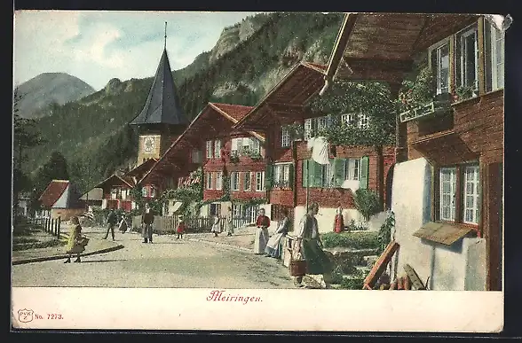AK Meiringen, Strassenpartie mit Holzhäusern und Anwohnern