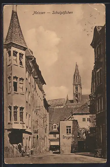 AK Meissen / Elbe, Strasse Schulgässchen mit Drogerie