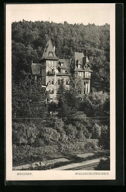 AK Meissen, Gasthaus Waldschlösschen aus der Vogelschau