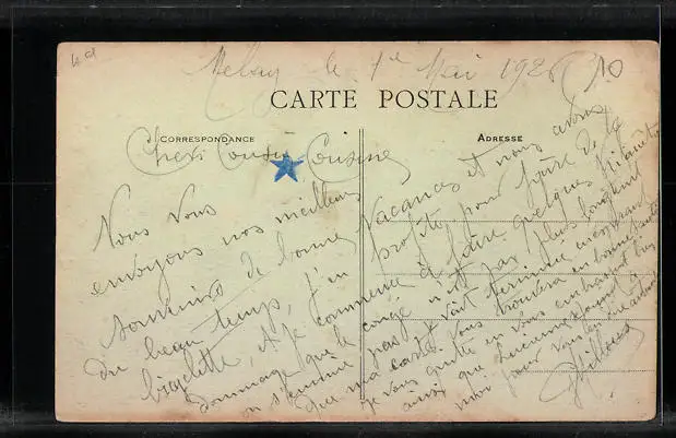 Personenbezogene Daten auf der Rückseite der Karte wurden durch blauen Textmarker unkenntlich gemacht. Die blauen Stellen sind auf die Vorderseite durchgeweicht und wirken sich negativ auf das Postkartenfoto aus