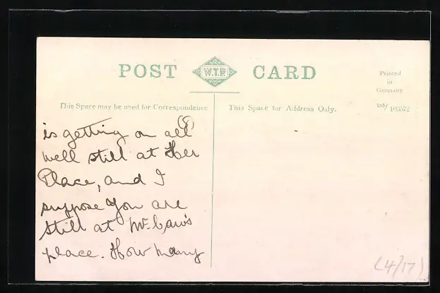Personenbezogene Daten auf der Rückseite der Karte wurden durch blauen Textmarker unkenntlich gemacht. Die blauen Stellen sind auf die Vorderseite durchgeweicht und wirken sich negativ auf das Postkartenfoto aus