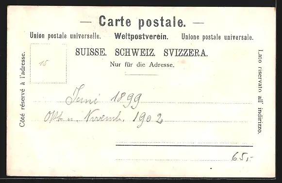 Personenbezogene Daten auf der Rückseite der Karte wurden durch blauen Textmarker unkenntlich gemacht. Die blauen Stellen sind auf die Vorderseite durchgeweicht und wirken sich negativ auf das Postkartenfoto aus