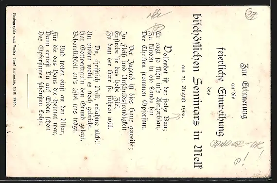 Personenbezogene Daten auf der Rückseite der Karte wurden durch blauen Textmarker unkenntlich gemacht. Die blauen Stellen sind auf die Vorderseite durchgeweicht und wirken sich negativ auf das Postkartenfoto aus