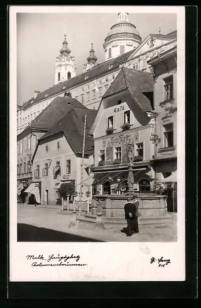 AK Melk, Strassenpartie mit Cafe Fürst und Brunnen