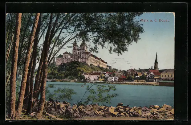AK Melk a. d. Donau, Flusspartie mit Stadtansicht