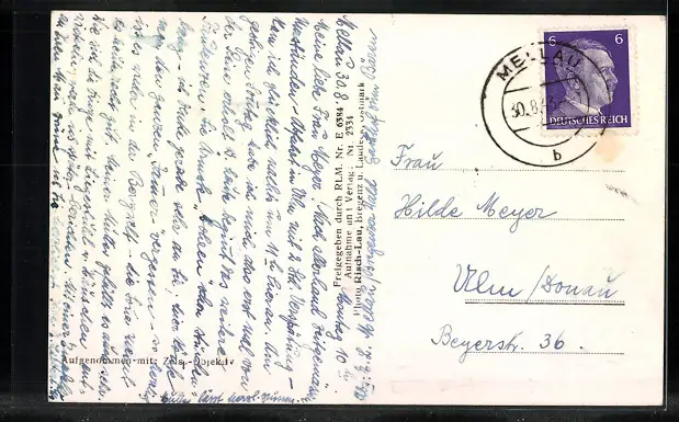 Personenbezogene Daten auf der Rückseite der Karte wurden durch blauen Textmarker unkenntlich gemacht. Die blauen Stellen sind auf die Vorderseite durchgeweicht und wirken sich negativ auf das Postkartenfoto aus