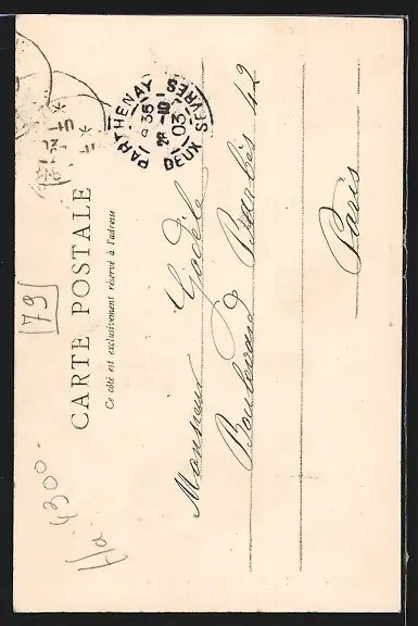 Personenbezogene Daten auf der Rückseite der Karte wurden durch blauen Textmarker unkenntlich gemacht. Die blauen Stellen sind auf die Vorderseite durchgeweicht und wirken sich negativ auf das Postkartenfoto aus
