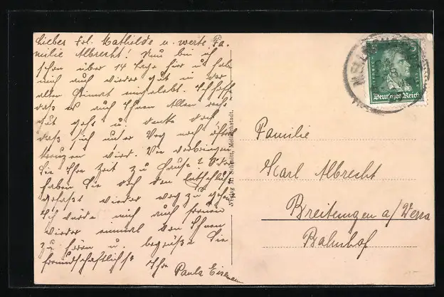 Personenbezogene Daten auf der Rückseite der Karte wurden durch blauen Textmarker unkenntlich gemacht. Die blauen Stellen sind auf die Vorderseite durchgeweicht und wirken sich negativ auf das Postkartenfoto aus