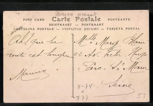 Personenbezogene Daten auf der Rückseite der Karte wurden durch blauen Textmarker unkenntlich gemacht. Die blauen Stellen sind auf die Vorderseite durchgeweicht und wirken sich negativ auf das Postkartenfoto aus
