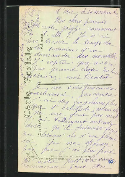 Personenbezogene Daten auf der Rückseite der Karte wurden durch blauen Textmarker unkenntlich gemacht. Die blauen Stellen sind auf die Vorderseite durchgeweicht und wirken sich negativ auf das Postkartenfoto aus