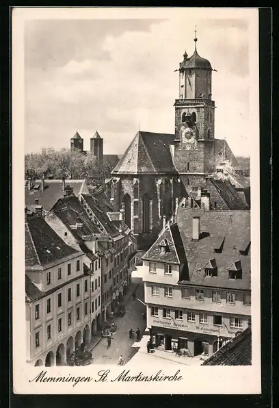 AK Memmingen, Martinskirche mit Geschäft Geschwister Keppeler