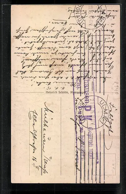 Personenbezogene Daten auf der Rückseite der Karte wurden durch blauen Textmarker unkenntlich gemacht. Die blauen Stellen sind auf die Vorderseite durchgeweicht und wirken sich negativ auf das Postkartenfoto aus