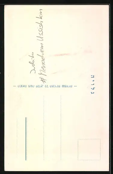 Personenbezogene Daten auf der Rückseite der Karte wurden durch blauen Textmarker unkenntlich gemacht. Die blauen Stellen sind auf die Vorderseite durchgeweicht und wirken sich negativ auf das Postkartenfoto aus