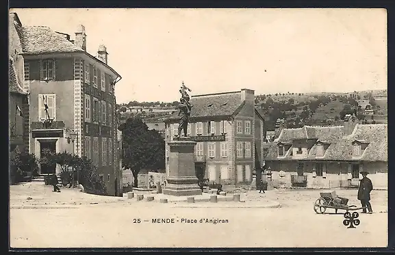 AK Mende, Place d`Angiran avec statue équestre et bâtiments environnants