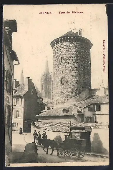 AK Mende, Tour des Pénitents avec calèche et passants dans la rue