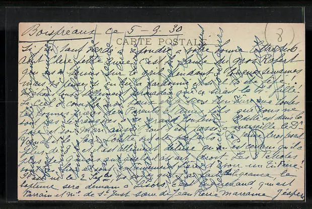 Personenbezogene Daten auf der Rückseite der Karte wurden durch blauen Textmarker unkenntlich gemacht. Die blauen Stellen sind auf die Vorderseite durchgeweicht und wirken sich negativ auf das Postkartenfoto aus