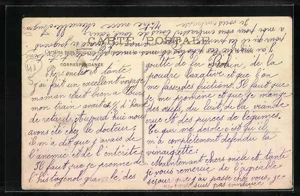 Personenbezogene Daten auf der Rückseite der Karte wurden durch blauen Textmarker unkenntlich gemacht. Die blauen Stellen sind auf die Vorderseite durchgeweicht und wirken sich negativ auf das Postkartenfoto aus