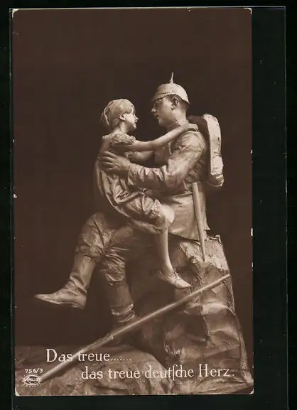 AK Menschen als Skulpturen, Soldat mit Kind