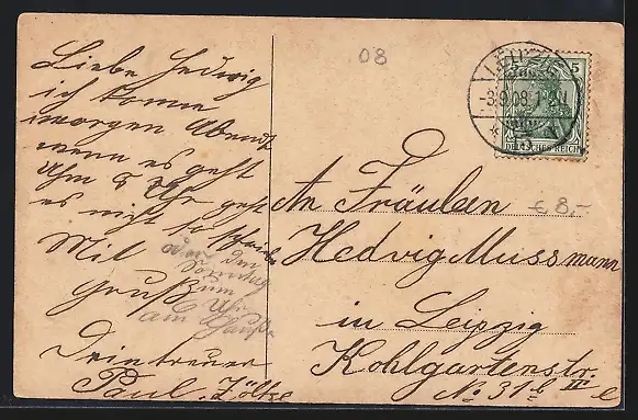 gelaufen 1908, Eckknicke links u. rechts, guter Zustand