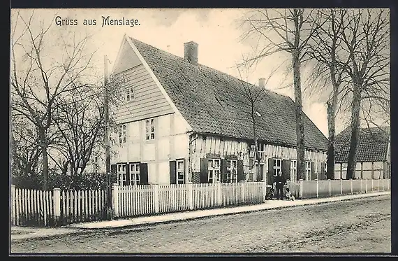 AK Menslage, Gasthaus, Mann mit zwei Hunden