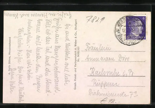 Personenbezogene Daten auf der Rückseite der Karte wurden durch blauen Textmarker unkenntlich gemacht. Die blauen Stellen sind auf die Vorderseite durchgeweicht und wirken sich negativ auf das Postkartenfoto aus
