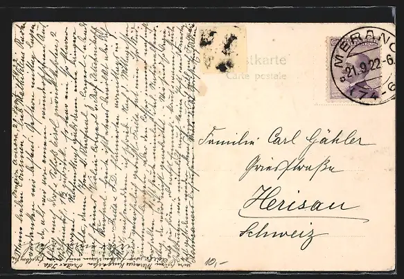 gelaufen 1922, rückseitig Klebe- und Papierreste, guter Zustand
