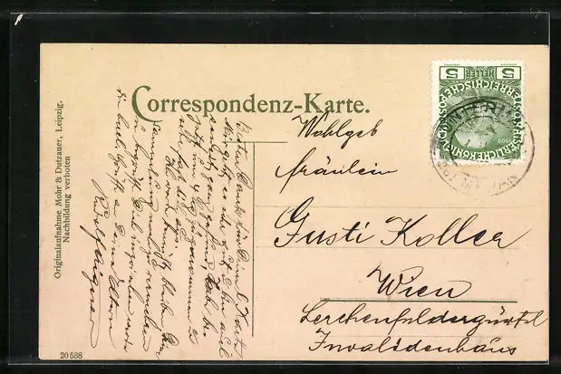 Personenbezogene Daten auf der Rückseite der Karte wurden durch blauen Textmarker unkenntlich gemacht. Die blauen Stellen sind auf die Vorderseite durchgeweicht und wirken sich negativ auf das Postkartenfoto aus
