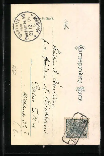 Personenbezogene Daten auf der Rückseite der Karte wurden durch blauen Textmarker unkenntlich gemacht. Die blauen Stellen sind auf die Vorderseite durchgeweicht und wirken sich negativ auf das Postkartenfoto aus