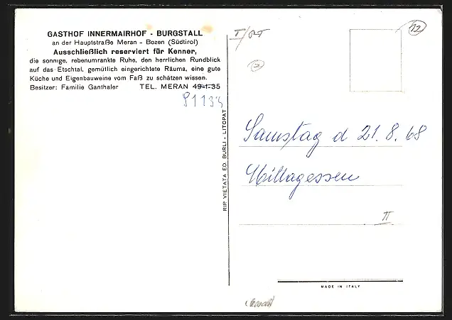 AK Meran, Gasthof Innermairhof-Burgstall an der Hauptstrasse