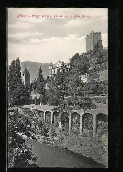 AK Meran, Gilfpromenade, Passeirertor und Pulverturm