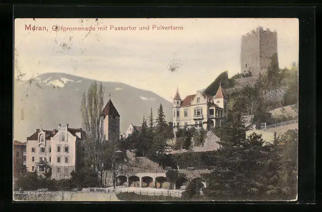 AK Meran, Gilfpromenade mit Passertor und Pulverturm