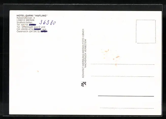 Personenbezogene Daten auf der Rückseite der Karte wurden durch blauen Textmarker unkenntlich gemacht. Die blauen Stellen sind auf die Vorderseite durchgeweicht und wirken sich negativ auf das Postkartenfoto aus
