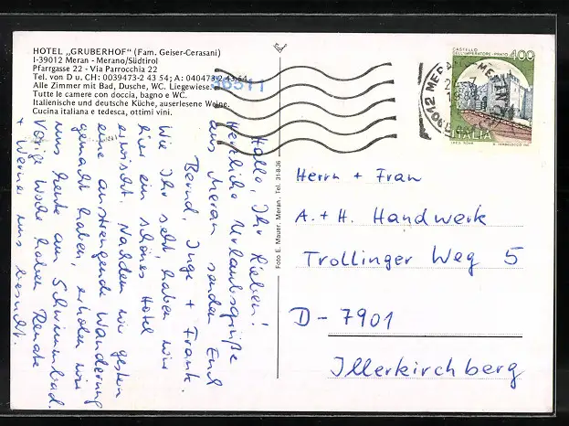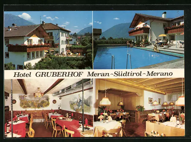 AK Meran, Hotel Gruberhof in vier Ansichten
