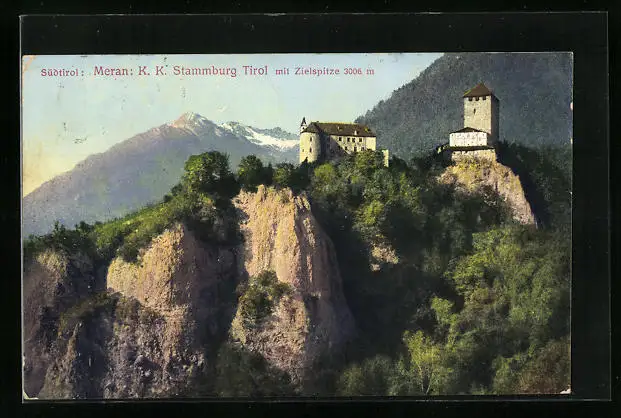 AK Meran, K. k. Stammburg Tirol mit Zielspitze