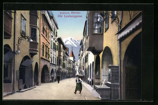 AK Meran, Laubengasse mit Brunnen