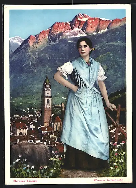 AK Meran, Ortspanorama mit Kirche, Frau steht in Meraner Volkstracht am Ortsrand