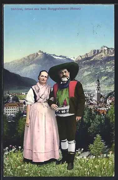 AK Meran, Paar in Südtiroler Tracht vor Orts- u. Bergpanorama
