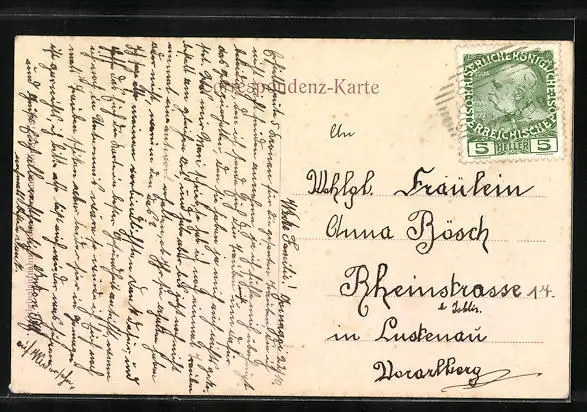 Personenbezogene Daten auf der Rückseite der Karte wurden durch blauen Textmarker unkenntlich gemacht. Die blauen Stellen sind auf die Vorderseite durchgeweicht und wirken sich negativ auf das Postkartenfoto aus