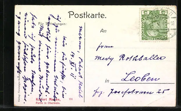 Personenbezogene Daten auf der Rückseite der Karte wurden durch blauen Textmarker unkenntlich gemacht. Die blauen Stellen sind auf die Vorderseite durchgeweicht und wirken sich negativ auf das Postkartenfoto aus