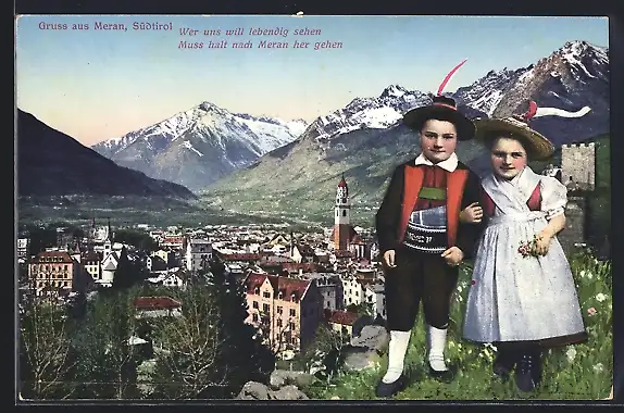 AK Meran, Stadtpanorama, Kinder in Tracht