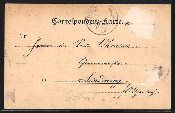 gelaufen 1899, vorder- u. rückseitig Klebe- und Papierreste, guter Zustand