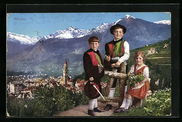 AK Meran, Totalansicht mit Kindern in tiroler Trachten