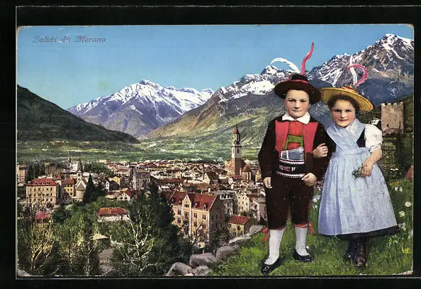 AK Meran, Totalansicht mit kindlichem Trachtenpaar