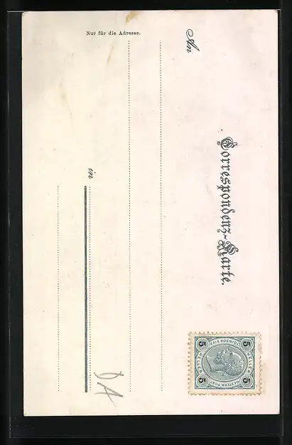 Personenbezogene Daten auf der Rückseite der Karte wurden durch blauen Textmarker unkenntlich gemacht. Die blauen Stellen sind auf die Vorderseite durchgeweicht und wirken sich negativ auf das Postkartenfoto aus