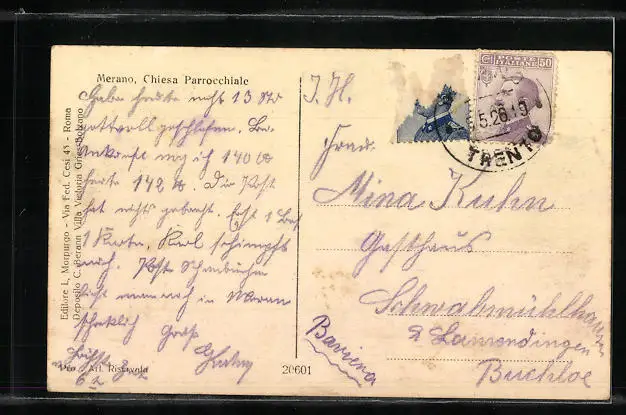 gelaufen 1926, Eckknick und Bugspur links oben, guter Zustand