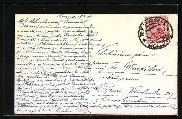Personenbezogene Daten auf der Rückseite der Karte wurden durch blauen Textmarker unkenntlich gemacht. Die blauen Stellen sind auf die Vorderseite durchgeweicht und wirken sich negativ auf das Postkartenfoto aus