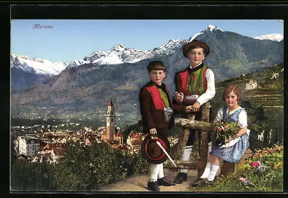 AK Merano, Teilansicht u. drei Kinder in Tracht