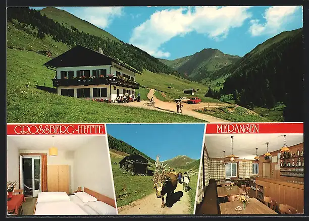 AK Meransen bei Mühlbach, Pension Grossberg-Hütte, Almabtrieb